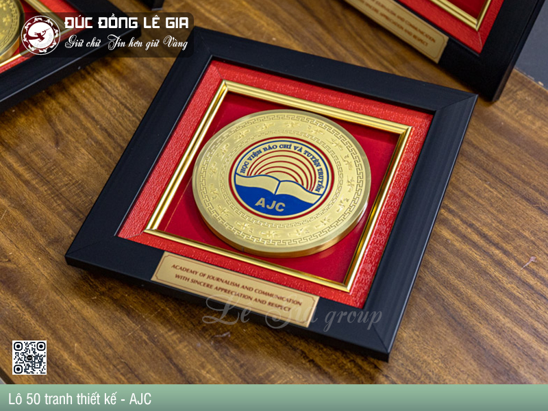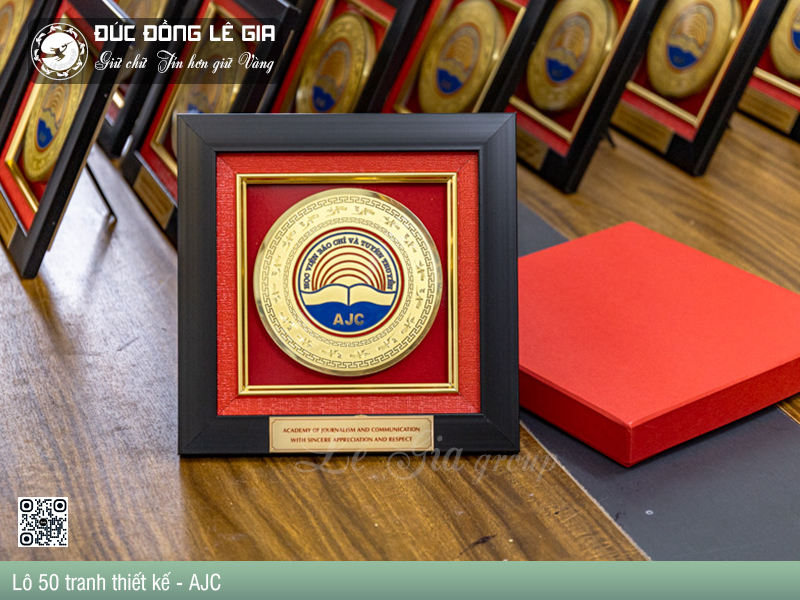 Tâm điểm của tác phẩm là biểu trưng Học viện Báo chí và Tuyên truyền – AJC được khắc họa nổi bật trên nền đồng vàng óng ánh, bao quanh bởi họa tiết hoa văn truyền thống Việt.