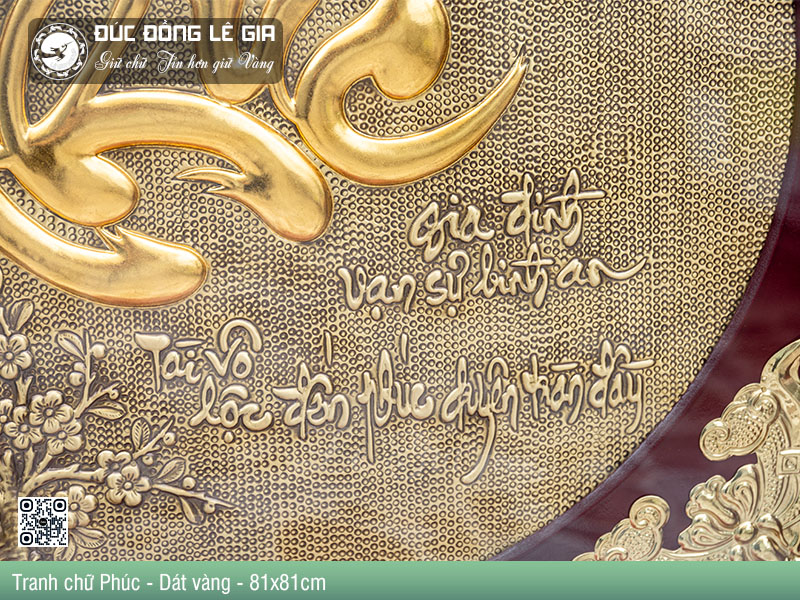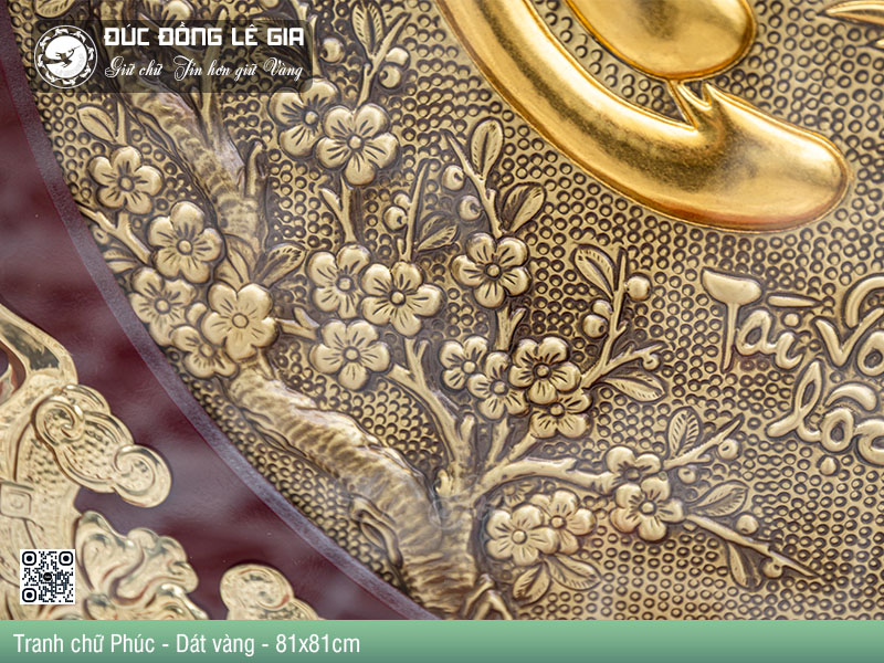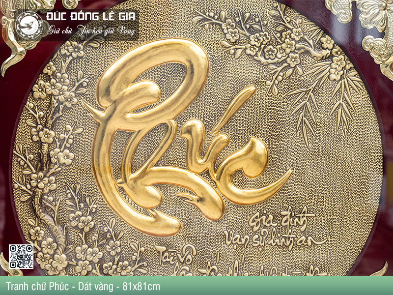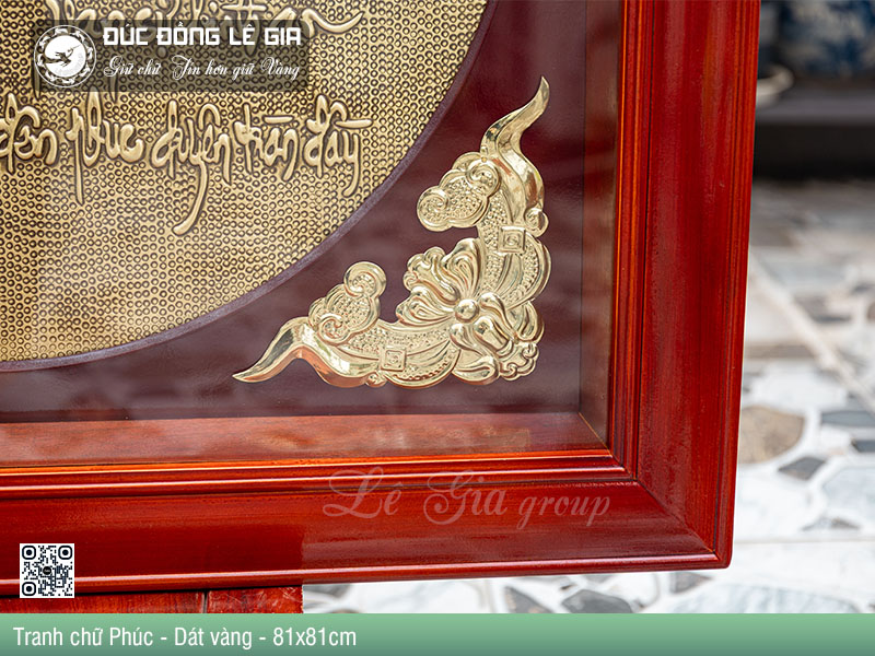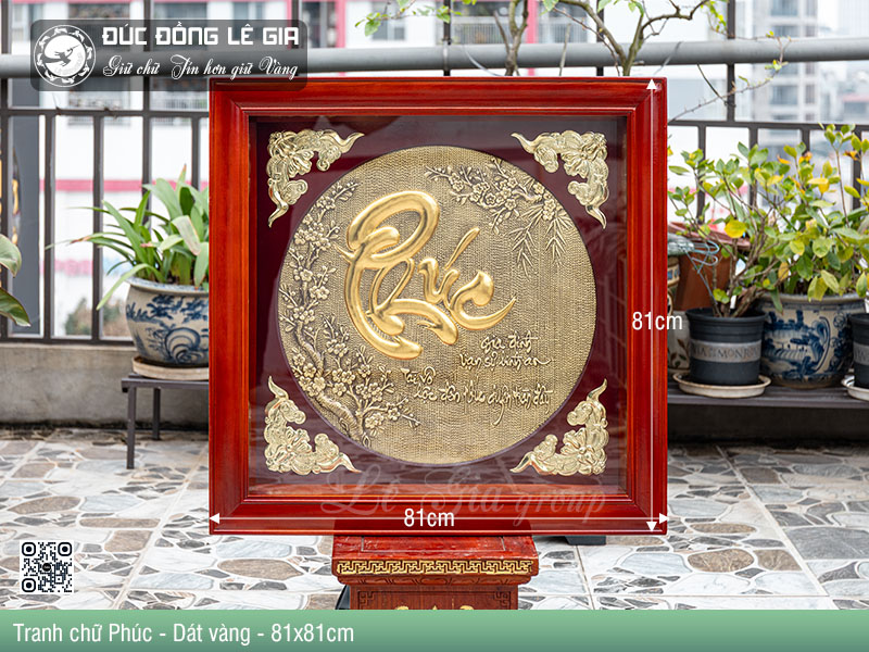 Sự kết hợp khéo léo giữ chữ Phúc cùng các hoạ tiết hoa văn khiến bức tranh trở nên sinh động cuốn hút và đặc biệt là tăng thêm ý nghĩa của bức tranh. Chữ Phúc được mạ vàng 24k nổi bật, là điểm nhấm của bức tranh. Kích thước tranh là 81x81cm hoặc hoàn toàn có thể làm theo yêu cầu của khách hàng. Quý khách cũng có thể làm khung đồng hoặc khung gỗ tự nhiên như gỗ hương, trò, gụ…