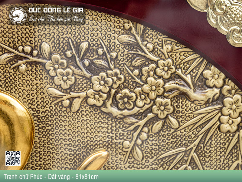 Bức tranh được chạm hoàn toàn thủ công trên tấm đồng dày 8 rem nhập khẩu từ Hàn Quốc. Bề mặt tranh được phủ lớp 2k sáng bóng vừa có tác dụng bảo vệ, vừa tăng tính thẩm mỹ. Chữ Phúc được chạm theo lối viết thư pháp với nét chữ uốn lượng mềm mại, uyển chuyển. Bên cạnh đó là hình ảnh của cành hoa mai cùng dòng chữ "Gia đình vạn sự bình an