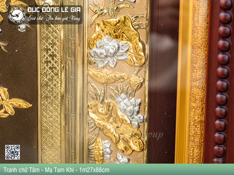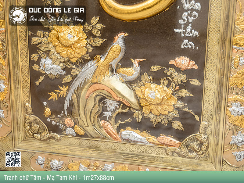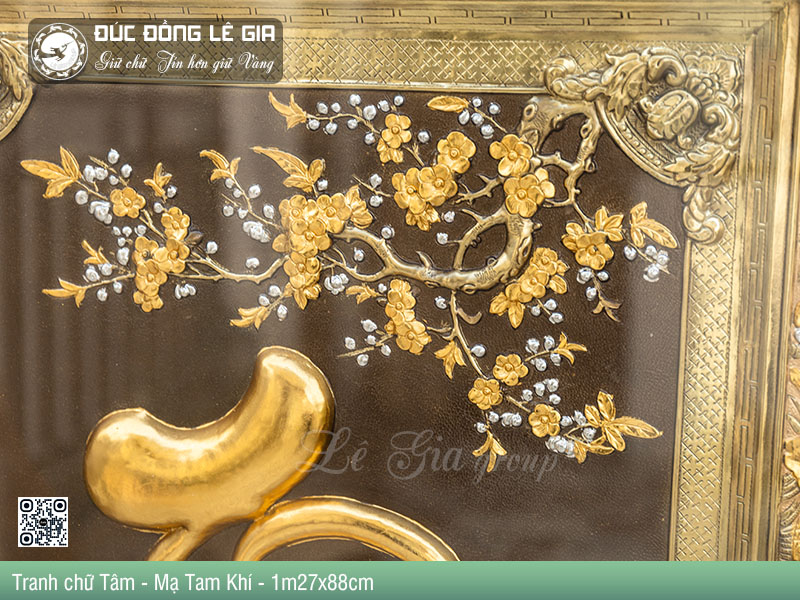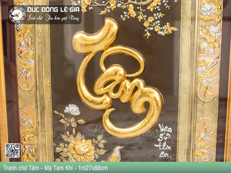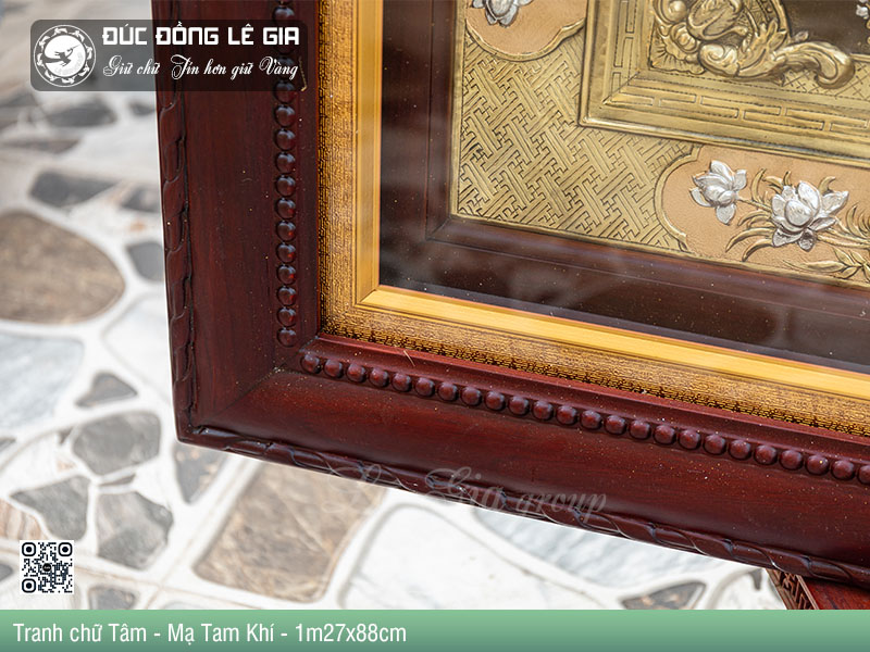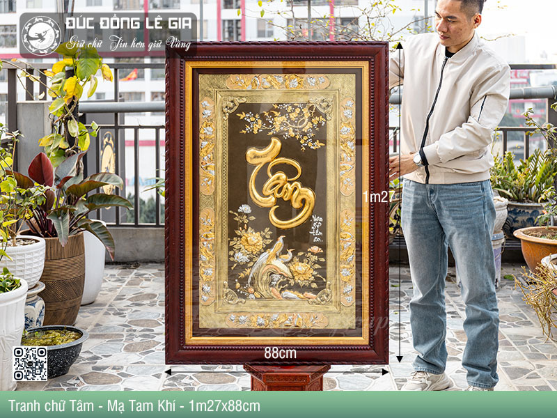 - Tên sản phẩm:Tranh chữ Tâm bằng đồng dát tam khí vàng 24k