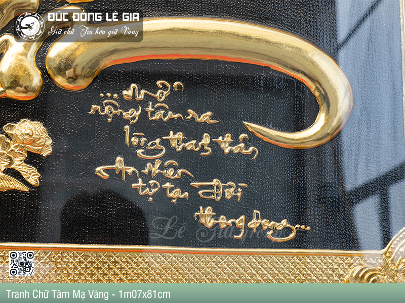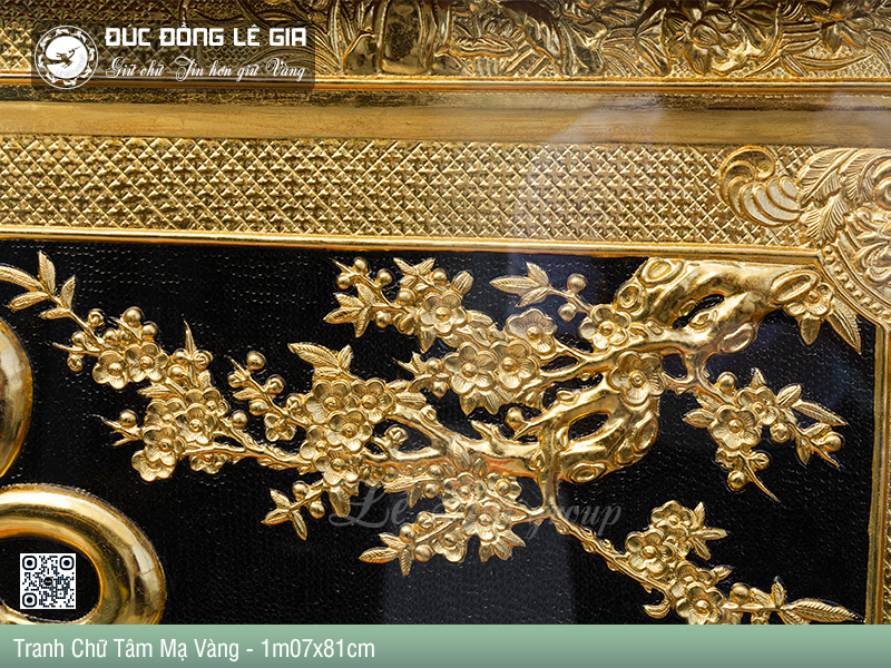 Bức tranh chữ Tâm mạ vàng toát lên sự sang trọng và đẳng cấp: chữ thư pháp mềm mại, sắc nét, hoa văn khắc họa cảnh mai - mẫu đơn tinh tế, mang đậm hồn Việt.