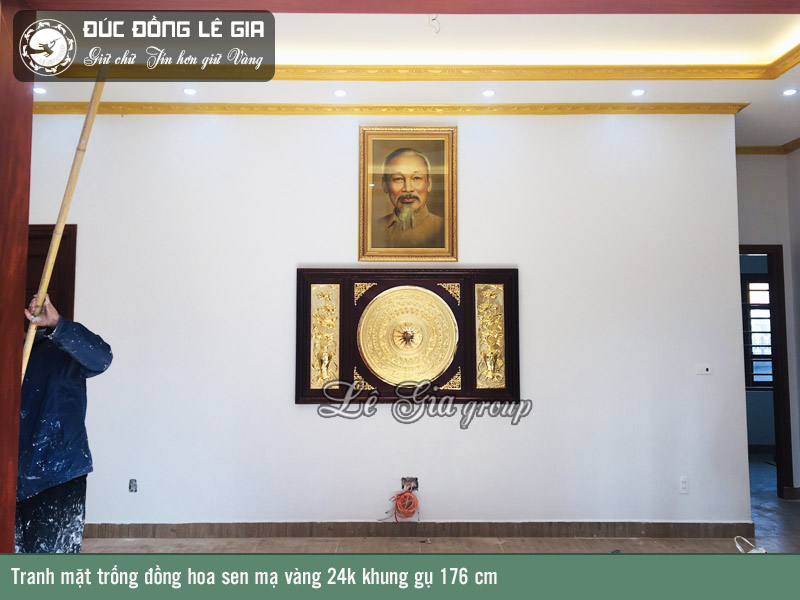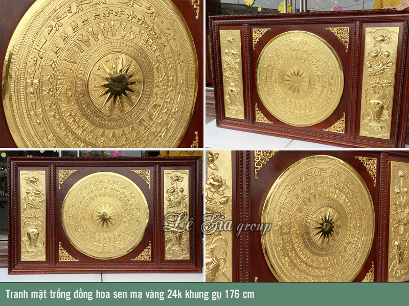 | Tên sản phẩm: | Tranh mặt trống đồng hoa sen mạ vàng 24k khung gụ 176x107 cm |