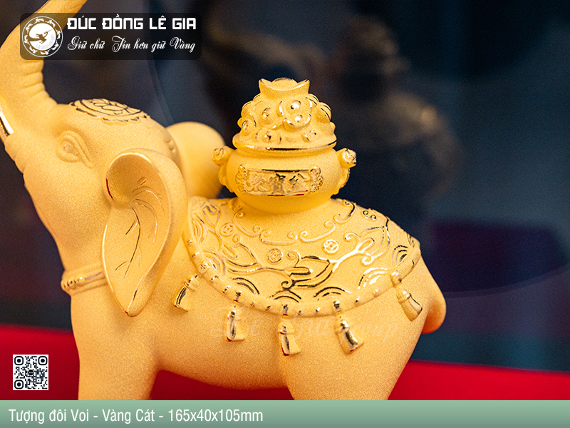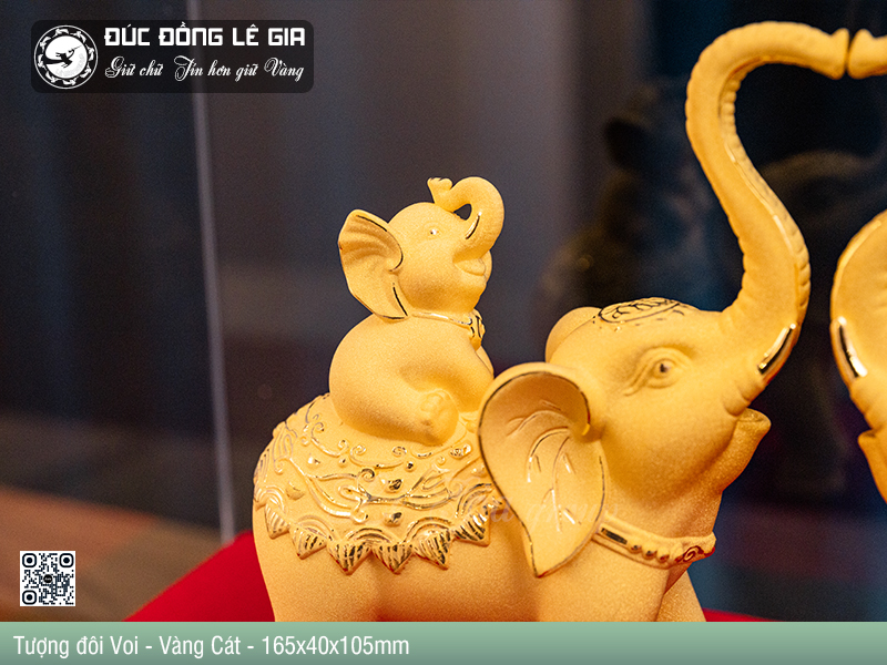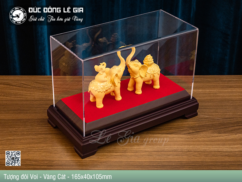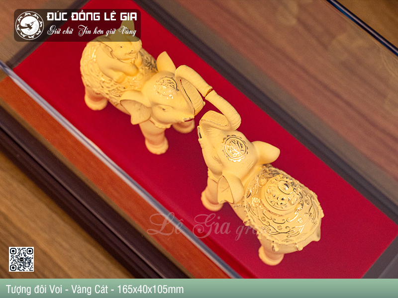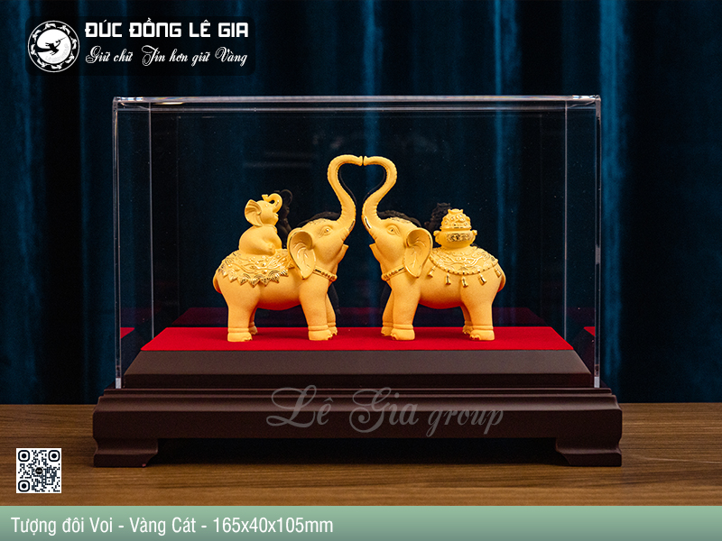 Trong ảnh, sản phẩm được trưng bày trang trọng trong hộp mica cao cấp với đế gỗ chắc chắn, tông đỏ – đen sang trọng làm nổi bật màu vàng cát lấp lánh của tượng. Cặp voi được tạo hình đối xứng, vòi chạm nhau thành hình trái tim – một chi tiết nhỏ nhưng đầy tính nghệ thuật và biểu tượng cho sự hòa hợp – gắn kết – yêu thương.