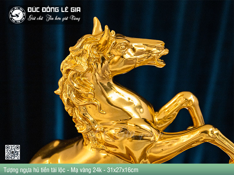 Trong phong thủy Á Đông, ngựa là linh vật của tốc độ, ý chí và sự thăng tiến. Hình tượng ngựa hí vươn cao mang hàm ý bứt phá mạnh mẽ, vượt chướng ngại để tiến tới thành công. Mẫu Tượng Ngựa Hí Tiến Tài Lộc mạ vàng 24K trong hình là một tác phẩm phong thủy tiêu biểu, hội tụ đủ thần – khí – hình, rất được ưa chuộng để trưng bày và làm quà tặng cao cấp.